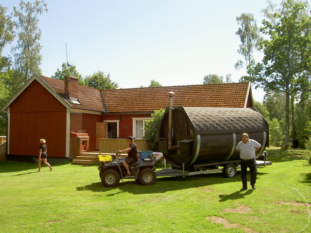 En vedeldad bastutunna körs på plats vid sjön där